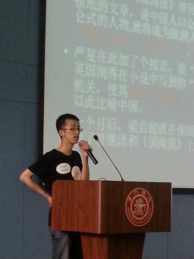 接下来是飞氘的讲座:“《向未来前进》——梁启超《新中国未来记》新解”。在这个讲座中,飞氘介绍了“拿破仑说过:‘中国是一头沉睡的狮子’”这一传言的前生今世,用一系列的考证结果讲述了这一传言的缘起和流变。在原初的版本中,中国被描述成一种译作“弗兰金仙”的怪物,而实际上这就是各位科幻迷都非常熟悉的“弗兰肯斯坦” ,这着实让在场观众们都大跌眼镜。