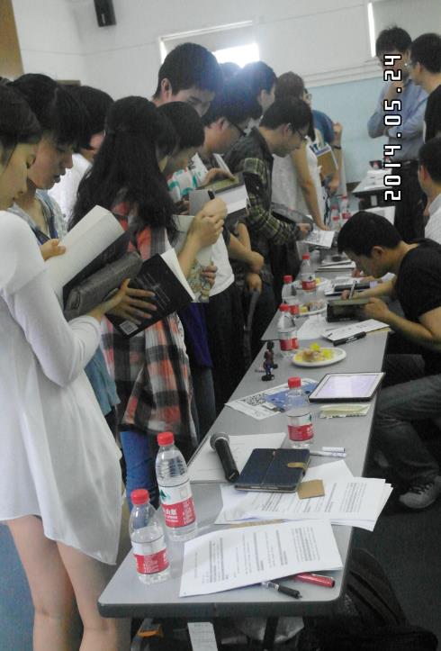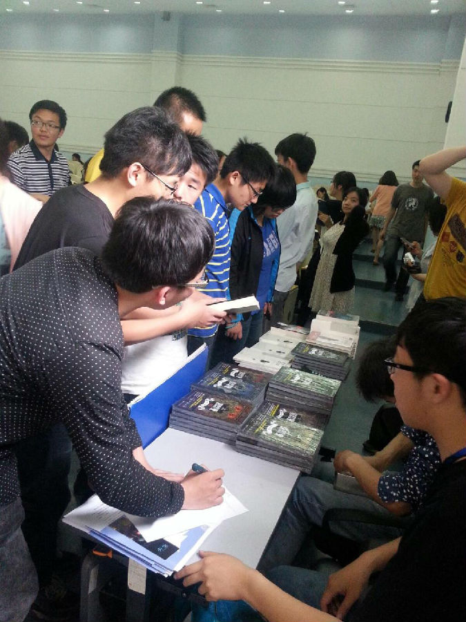 游戏之后便是中场休息,大家纷纷奔向了各位嘉宾以求签名。场间气氛热烈而友好。在本场活动中,交大曦潮书店在场地门口设置了临时摊位,现场销售参加活动的几位嘉宾的著作,对于观众来说实在是方便之极。