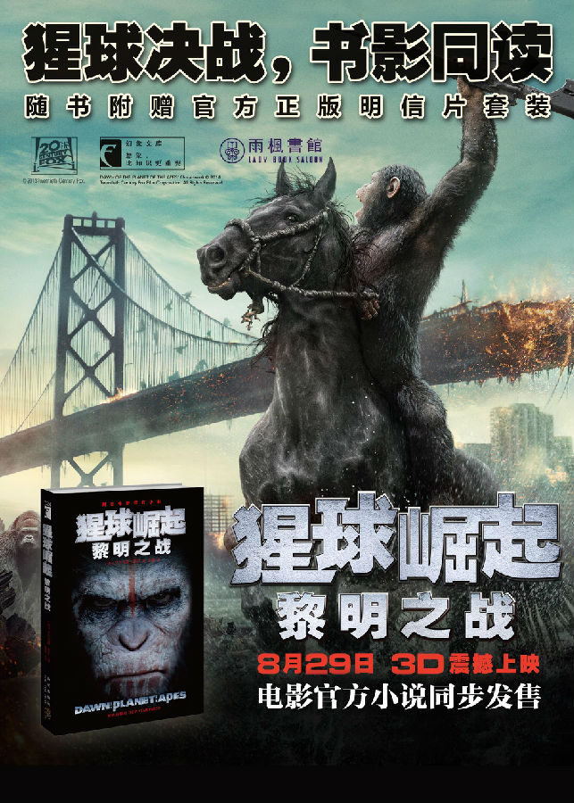 2014年,8月29日,第二部《猩球崛起2:黎明之战》国内即将震撼公映;官方小说同步上市,科幻巨作载誉归来!